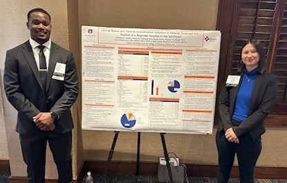 Madison Sanders and Randy Hooks, both members of the Class of 2023 took third place in the poster competition at the 70th Annual AlSHP Annual Clinical Meeting in Prattville. The poster was titled “Clinical Status and Time to Antiretroviral Initiation in Patients Screened HIV-1 Positive at a Regional Hospital in the Southeast,” and Dr. Kelly Hester served as a co-author.